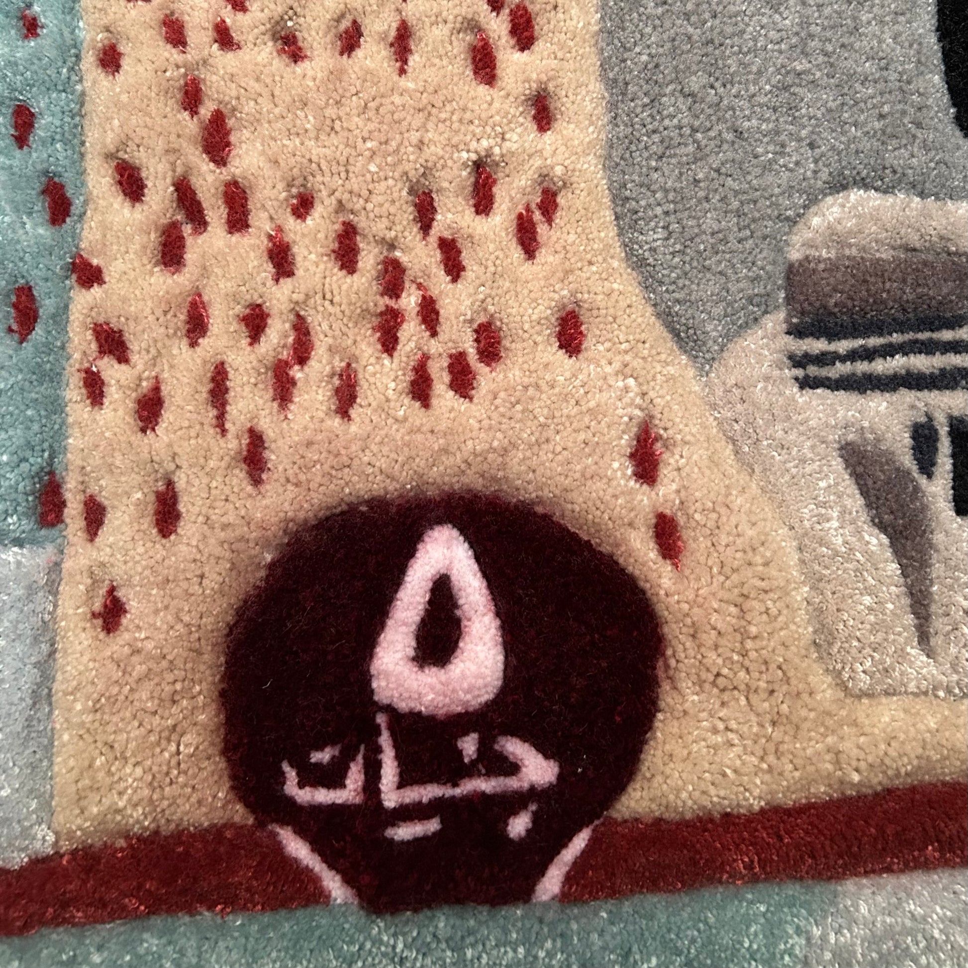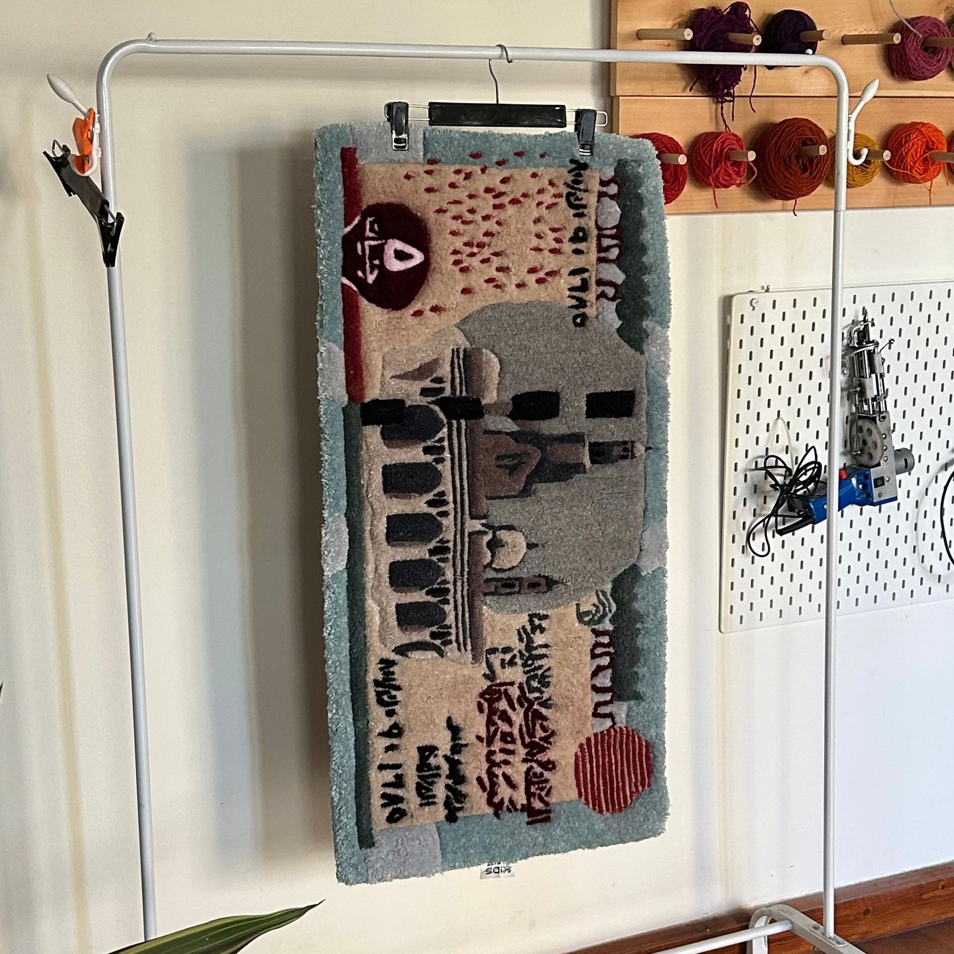 Finishing: Transparent white glue to secure tufting; polyester backing with twill tape around the edges.