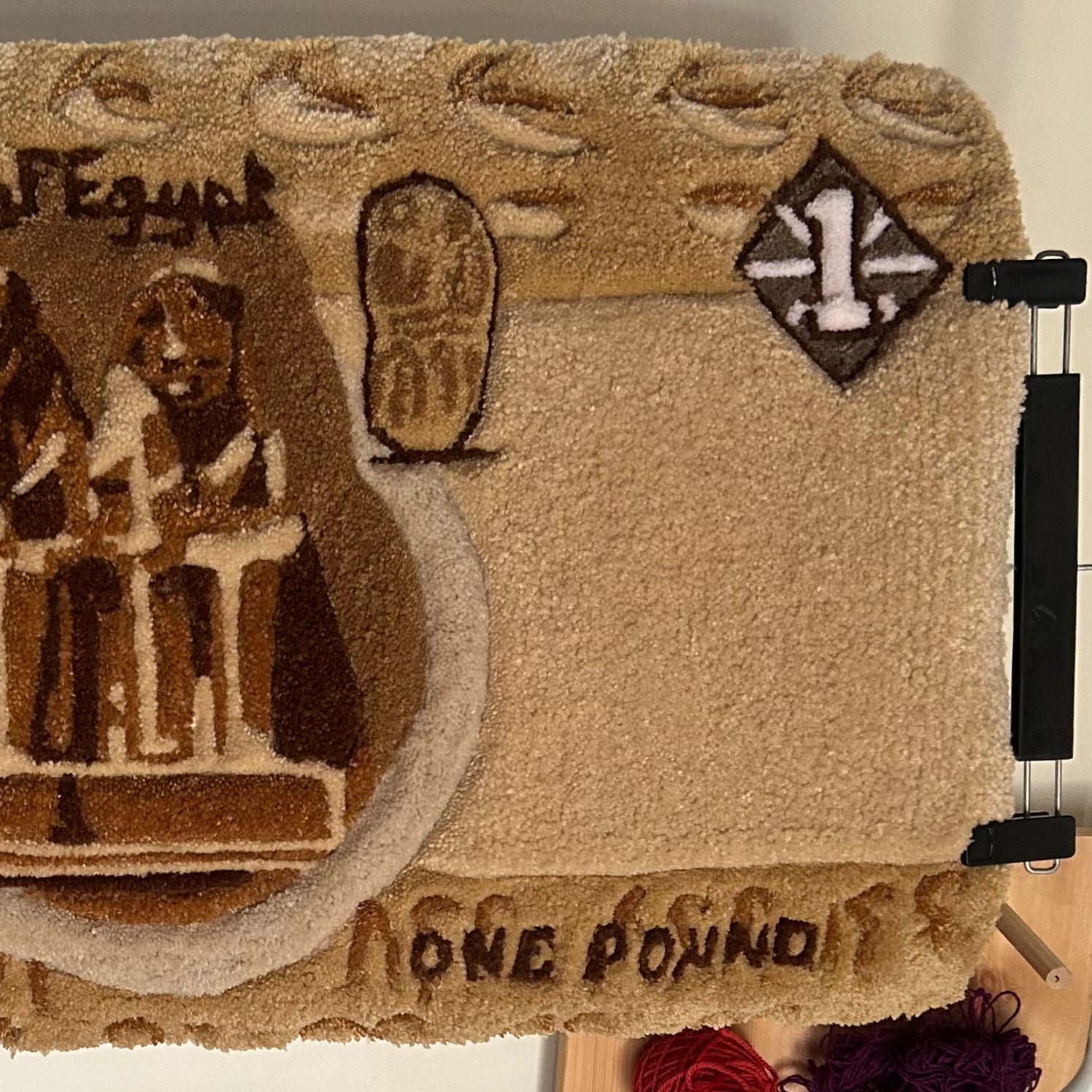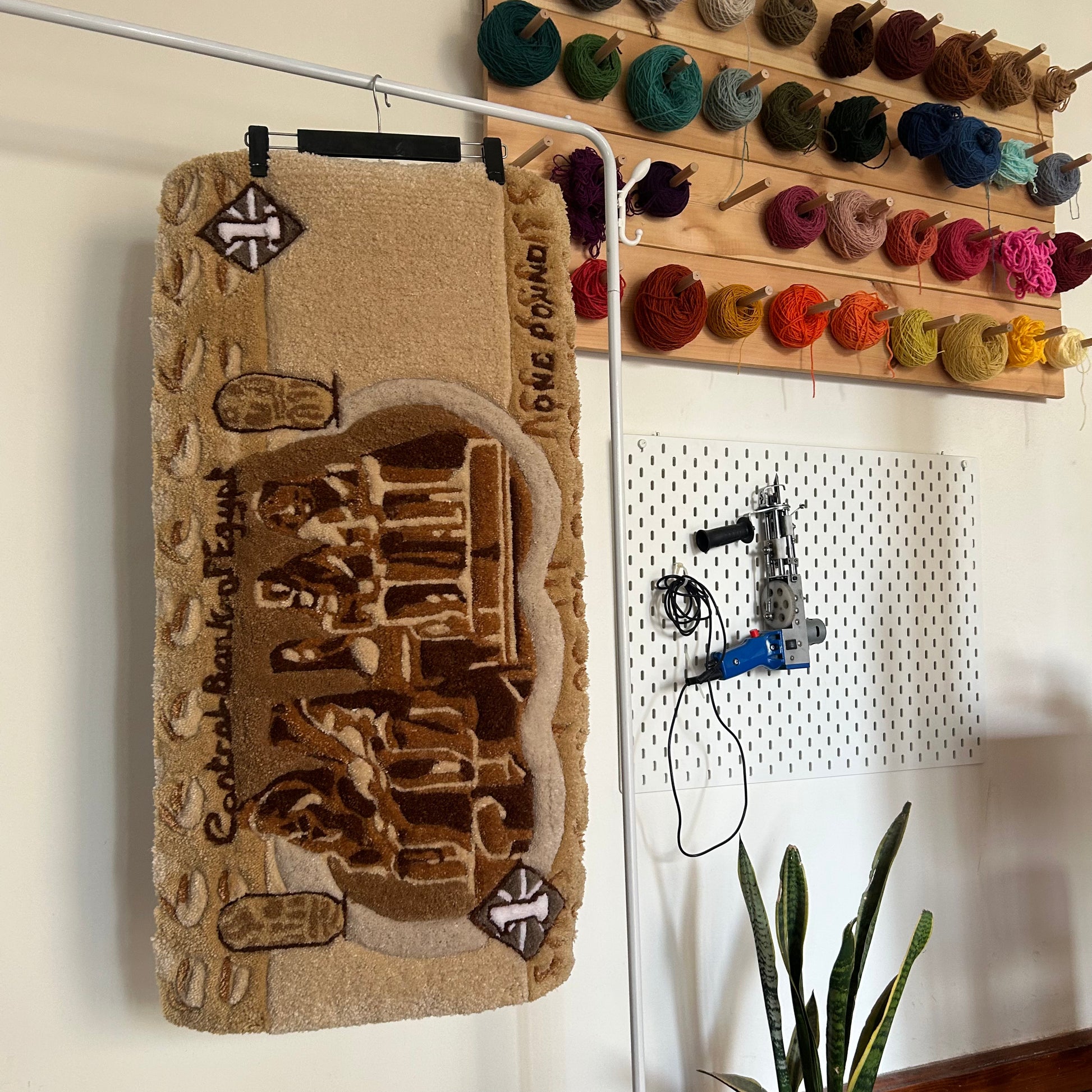 Transparent white glue to secure tufting; polyester backing with twill tape around the edges.